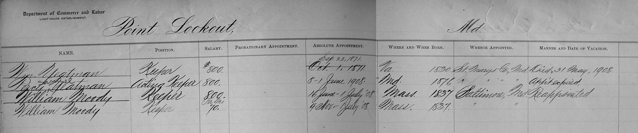 | NA-3-00512-13 | Payroll Register | 1871-1908 | Manner and date of Vacation: Died, May 31, 1908. |