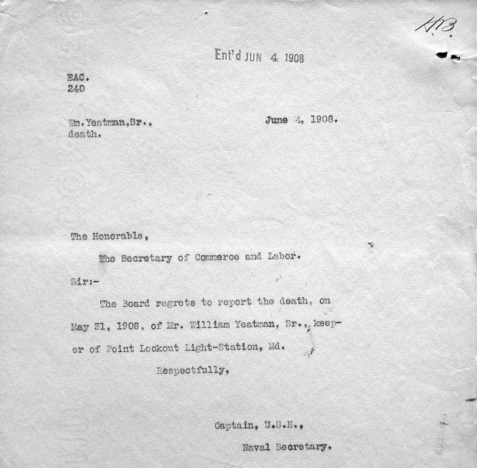 | NA-48-01098 | Letter | 06/04/1908 | Letter from the board about the death of William Yeatman. |