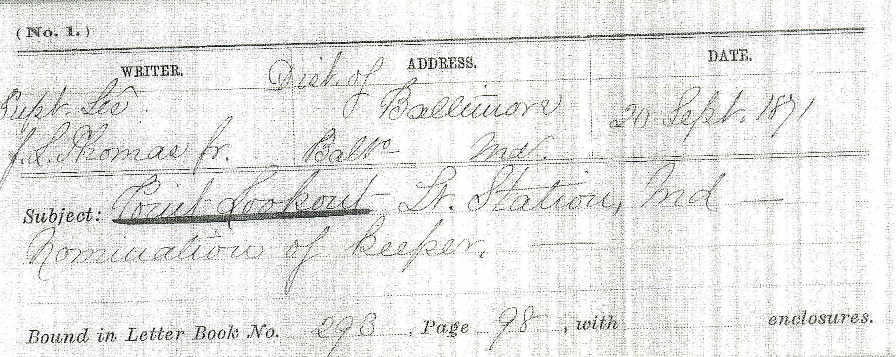 | NA-LTR-00914 | Letter | 09/20/1871 | Nomination letter for William Yeatman, after the resignation of William Moody. (Notice the fire damage along the edges.) |