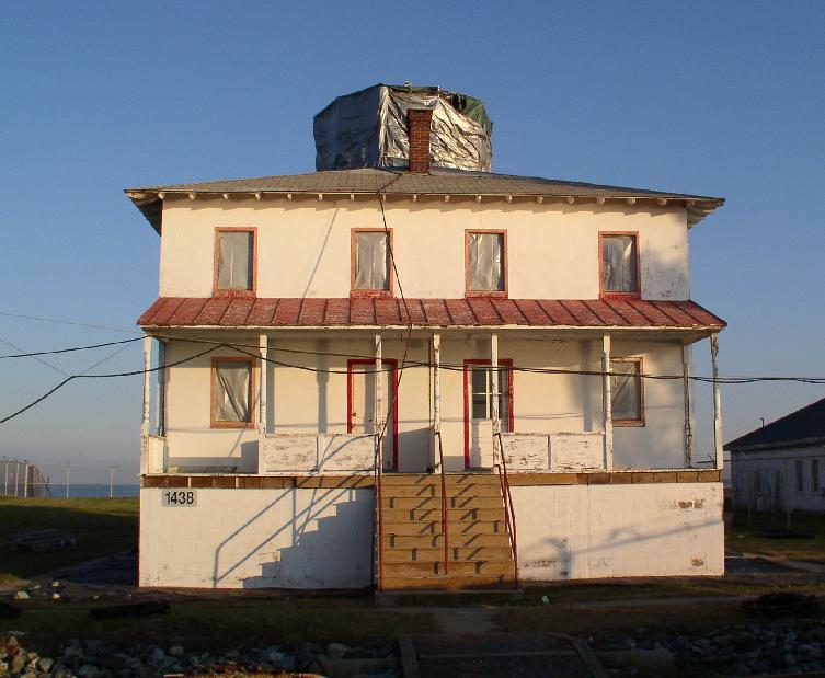 Picture of the back side of the lighthouse (facing the buoy sheds). Notice the plastic sheeting in all the windows. The windows were really in bad shape and some were in danger of crumbling and falling to the ground.