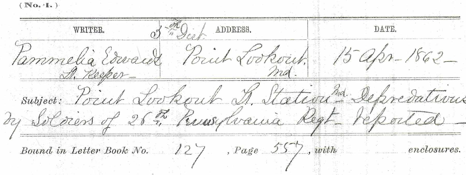Initially, the 26th PA could not be verified as being at Point Lookout in April of 1862. There is no Regimental history of the 26th PA, so finding information about just where they were on specific dates was a slow process. An entry exists in a book entitled the "History of the 2nd Regiment New Hampshire Volunteers" by Martin A. Hayes that probably explains Pamelia's report. The 2nd NH was in the same Brigade as the 26th PA. A number of the Regiment departed on several steamers from Budd's Ferry on April 7, 1862, and when they hit rough weather, they anchored in St. Mary's Bay to wait out the storm. However, for some of the 26th PA companies, the 2nd NH History indicates that 3 companies of the 26th PA along with the 2nd NH were actually dropped off at Point Lookout when the steamer captain refused to go out in the river due to the rough weather. The soldiers spent 3 days stranded at Point Lookout with little rations & apparently used the lighthouse garden fence for firewood. They also scavenged "a few hundred pounds of bacon which were discovered in the vicinity". Whether this was from the lighthouse stores is not known. It is interesting that only the 3 companies of the 26th PA were written up in the report, when there were also 10 companies from the 2nd NH apparently involved. It is unfortunate that we don't have Pamelia's actual report to see whether the theft of the garden fence was the only 'depredation' she encountered.